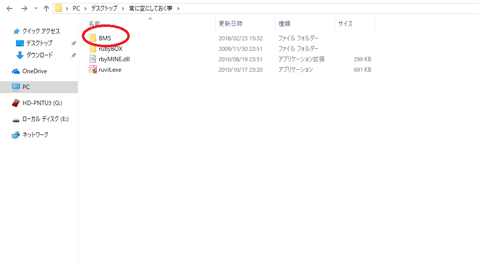 赤い丸で囲ってあるように、「BMSフォルダ」というフォルダを1個、用意します